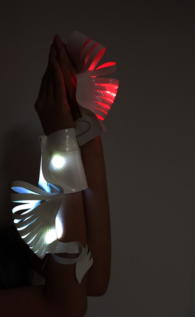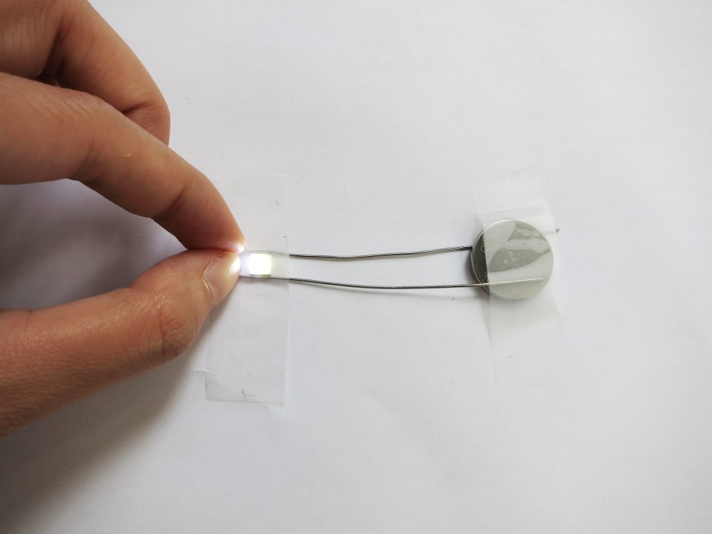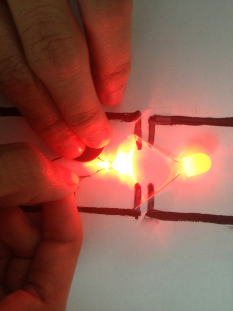 The circuit won’t be worked until you clap your handsand start dancing. I played with part-assembly technique. To make a powerful light effect you need more than one unit working together, like a team of skeletons in the cartoon. The experimental part (using solder wire and conductive ink):